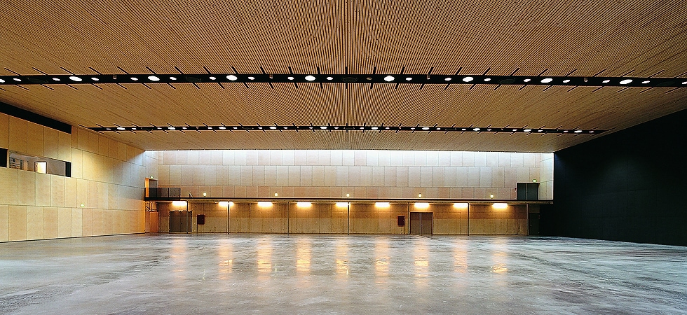 The relocation of the Arlberg railway line from the north-western terrace above St. Anton to the less sun-spoiled, shaded side of the valley provided a unique opportunity for the development of the village. In 1998, Dietrich/Untertrifaller won the competition to design the ARLBERG-well.com Center. Structurally complete, it served as the Accredited Media Center for the 2001 World Alpine Ski Championships. The generously laid out facility including a multi-purpose hall, spa and a restaurant area, built on the newly reclaimed area, constitutes a vital interface between the ski slopes and the village. Where once the railway tracks embodied a stringent separation, an open promenade has developed.